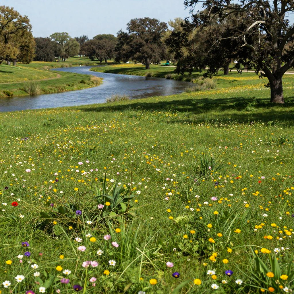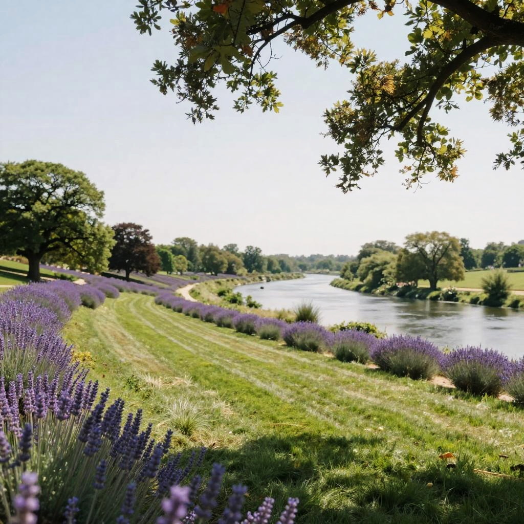 Photograph of a bright lavender hillside with manicured greens, winding river, and oak trees casting shadows. Wide-angle lens (24mm) with shallow depth of field, serene and tranquil atmosphere, high-quality landscape photography.