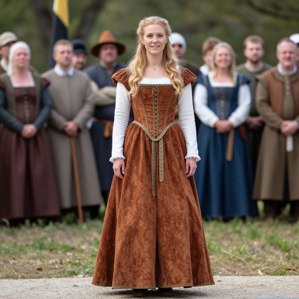 Photograph of a smiling young woman in a medieval-style, rust-brown velvet gown with white blouse, standing in front of a blurred group of similarly