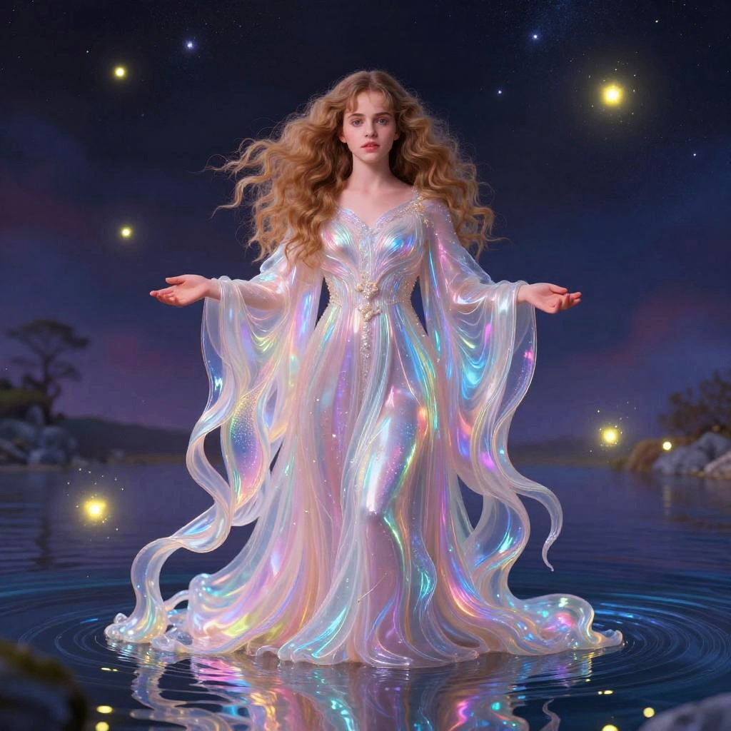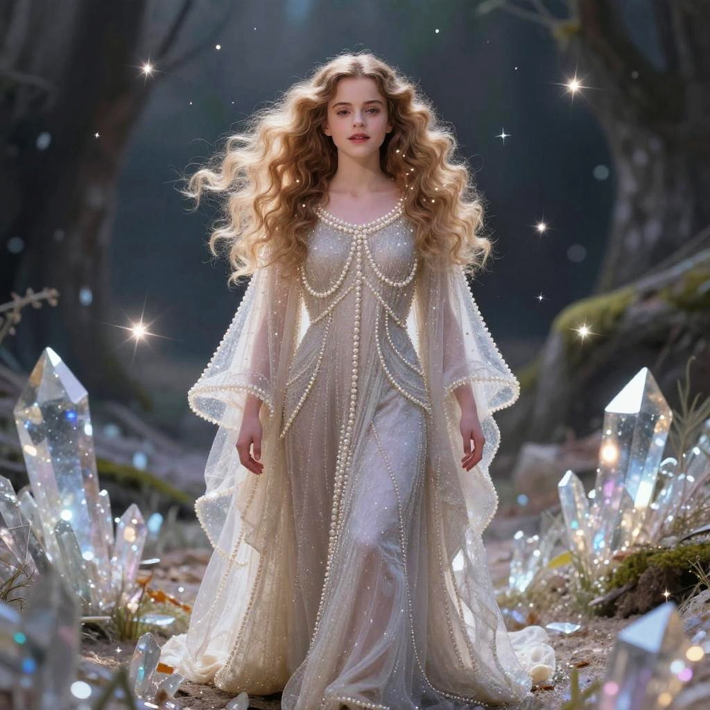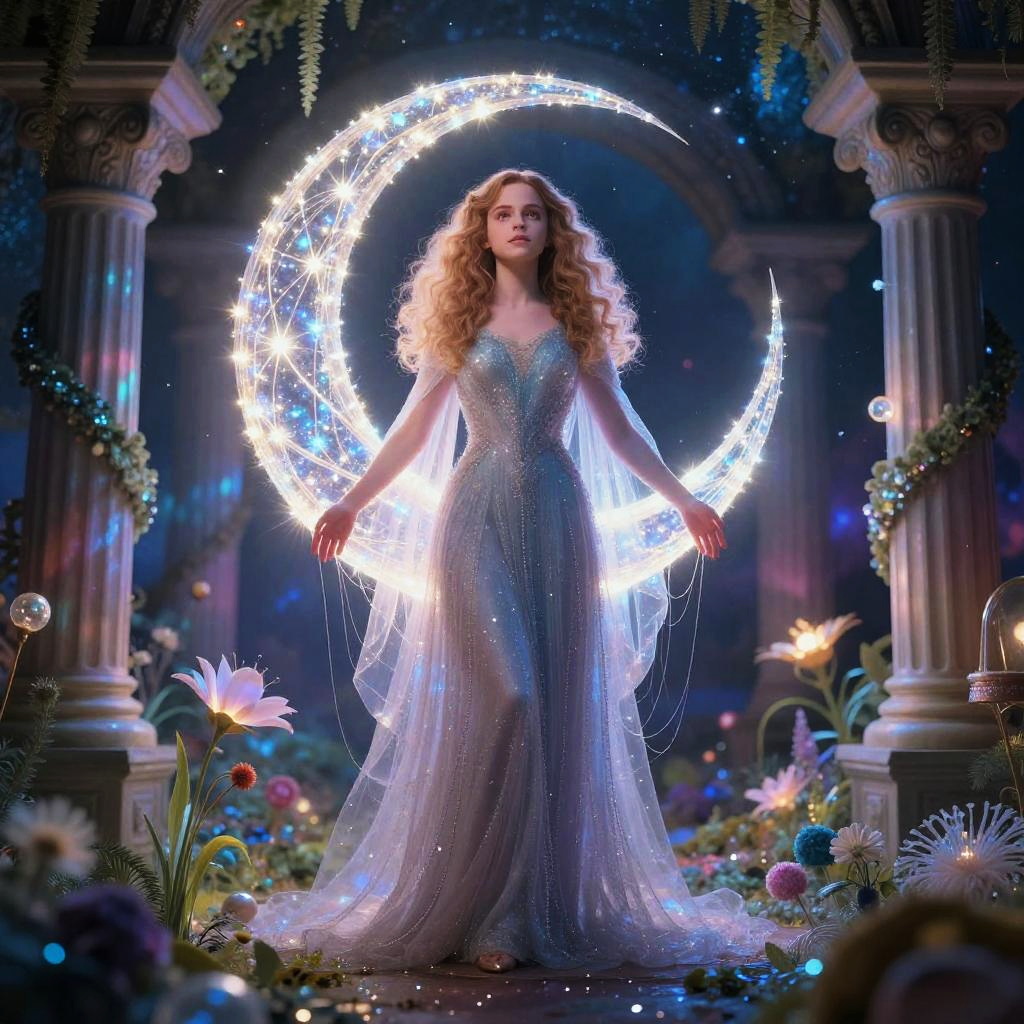 A whimsical, dream-like Hermione Granger depicted as a celestial figure, with twinkling starry locks, surrounded by dancing fairy lights, standing in a enchanting moonlit forest.