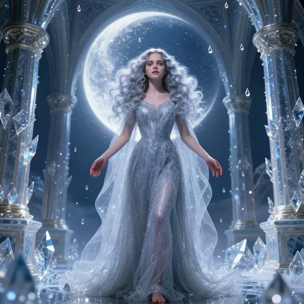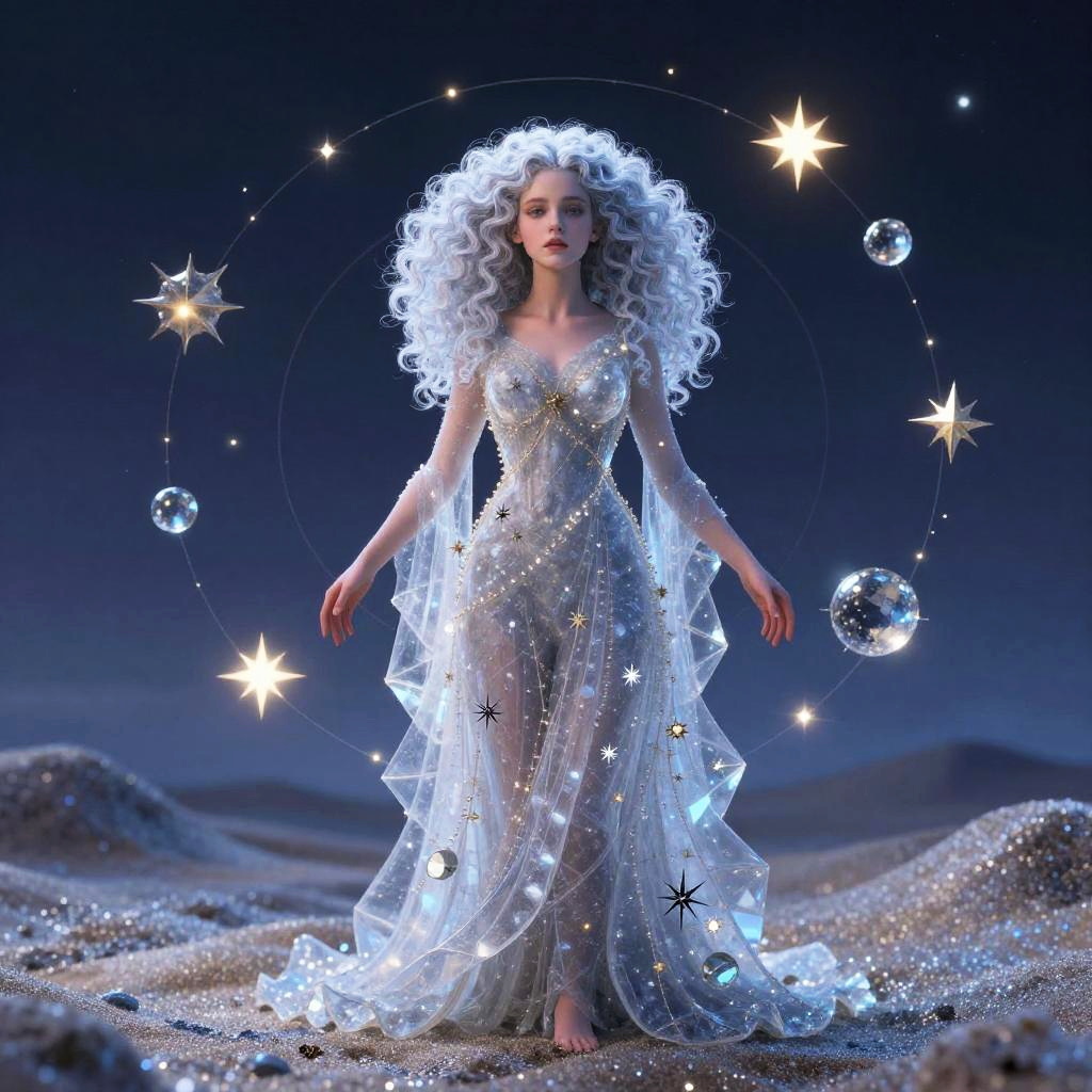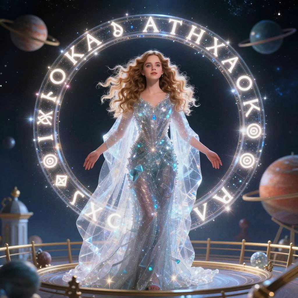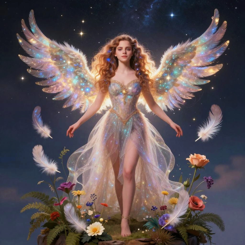 A whimsical, dream-like Hermione Granger depicted as a celestial figure, with twinkling starry locks, surrounded by dancing fairy lights, standing in a enchanting moonlit forest.