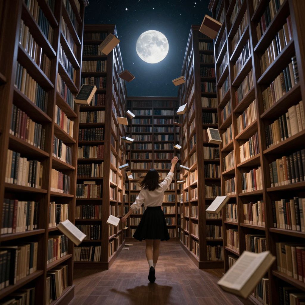 Photograph-like digital art of a library at night, featuring a woman with long dark hair, wearing a white blouse and black skirt, running down a central aisle between tall, wooden bookshelves filled with books. The sky above is starry with a full moon illuminating the scene. Books are floating mid-air, some falling from the shelves. The floor is dark wood, and the shelves are brightly lit, creating a dramatic contrast. The woman's back is to the viewer, and she is reaching up with both arms.