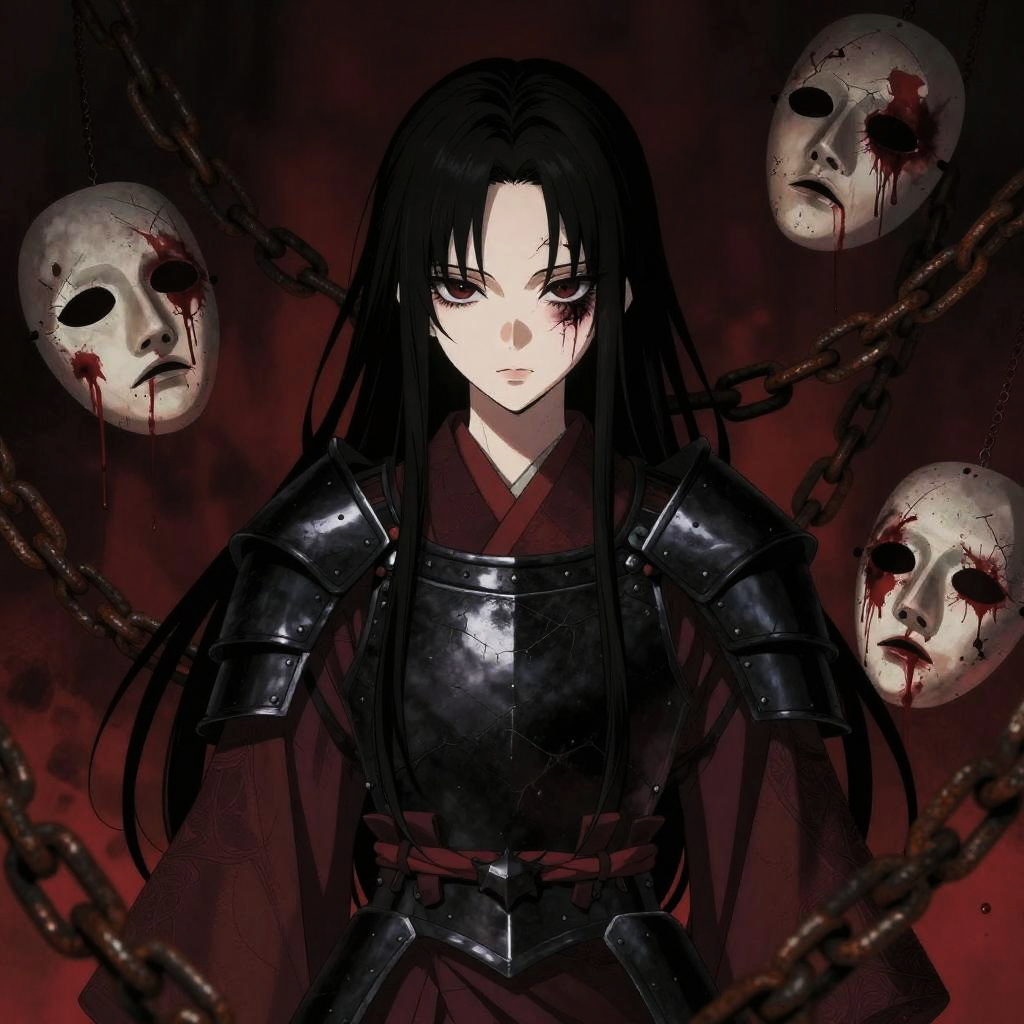 Dark gothic anime portrait of a girl with sunken eyes and violet-tinted black hair, wearing a black lace yukata with crimson sashes, rendered with intricate detailed line work. The background is filled with mirrored masks in grayscale with crimson eyes. High contrast lighting emphasizes dramatic shadows, creating a moody and intense atmosphere with rich red and black tones, subtle textures, and an elegant and mysterious vibe.