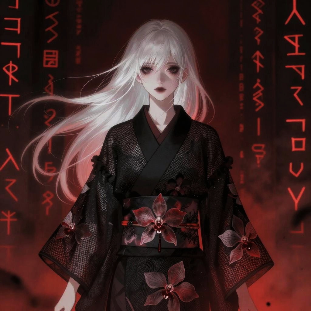 Digital artwork depicting a dark gothic woman with short black hair and glowing red eyes. She wears a black intricate lace mask covering her nose and cheeks, and a black kimono with red accents. The background features intricate black patterns forming wings and a circular halo with red edges, emphasizing the mysterious and eerie atmosphere.