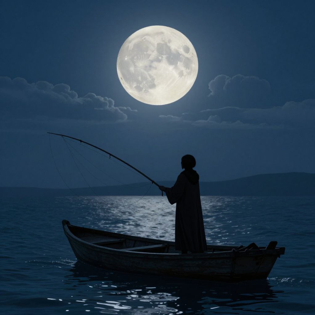 This digital illustration depicts a silhouetted person fishing in a small boat under a luminous full moon. The figure stands in the boat, holding a long fishing rod, with the moon's bright white light casting a reflection on the dark blue water. The sky is a deep navy blue, with scattered clouds. The boat is simple, with a pointed bow and stern, and the person's gender is indistinguishable due to the silhouette. The overall scene exudes a serene, nocturnal ambiance, emphasizing the contrast between the dark surroundings and the bright moon.