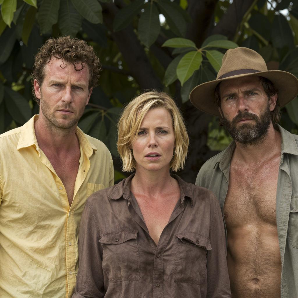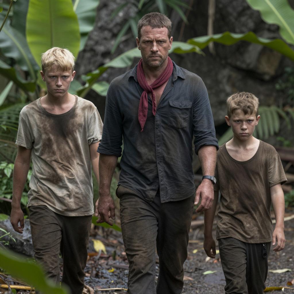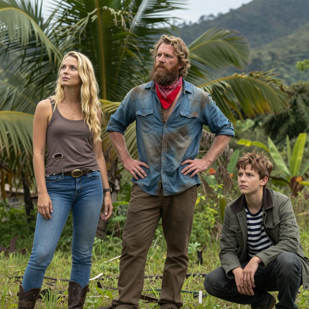 Three people sit on a large tree root. A man with dirty, unkempt hair and a blue shirt holds a white object. A blonde woman with a brown top leans forward, resting her arm on the root. A blonde child with curly hair in a brown shirt looks intently at the object. Sunlight filters through the trees in the background. The man's facial expression is focused, the woman's expression is curious, and the child's expression is concentrated.