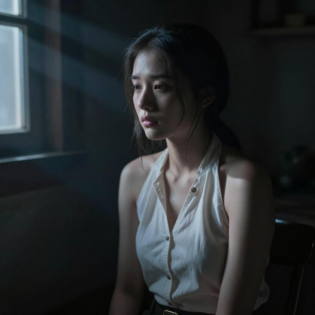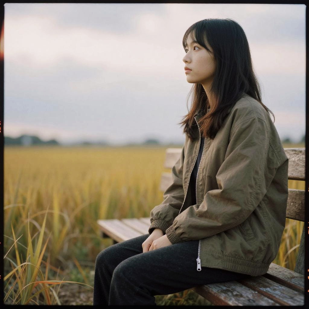 From side, The girl sat in the (wooden bench or stool:1.2), as if waiting for someone, jacket, realistic, upper body, (Yellow grass), cloud, lens_flare, Natural light, Grey Film filter, (KODAK Ektar 100:1.2), portrait