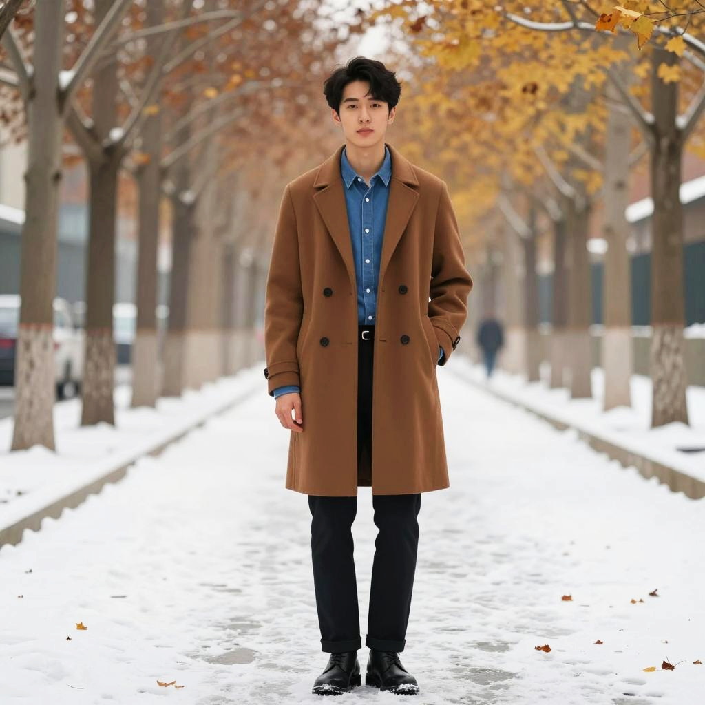 A stylish young man stands confidently on a snowy walkway lined with autumn trees, dressed in a fashionable brown coat paired with a blue shirt. His relaxed pose and the serene environment create an inviting and warm atmosphere, perfect for autumn fashion inspiration.