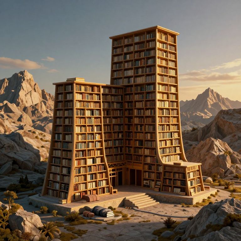 A surreal 3D-rendered landscape blends the architectural grandeur of towering bookshelves with the rugged beauty of mountainous terrain, where sunlight bathes the scene in a dramatic golden-hour glow, evoking a dreamlike library of stone that reconfigures itself under the whimsical influence of nearby slumberers' nocturnal visions.