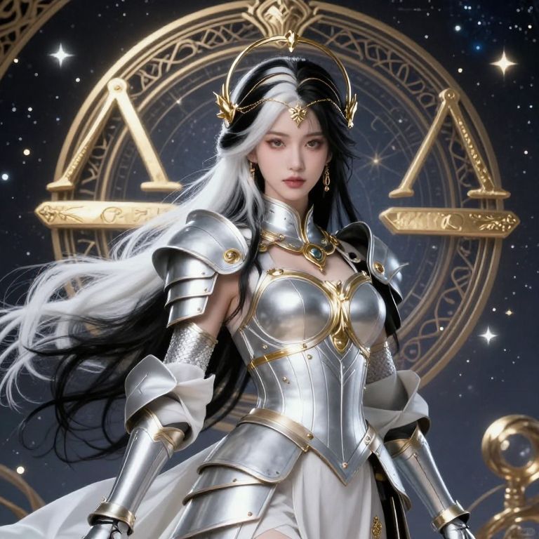 A highly detailed, ethereal female knight godess with black and white hair, adorned with gold accents and a zodiac sign Libra, stands in a fantastical setting with intricate designs and celestial elements.