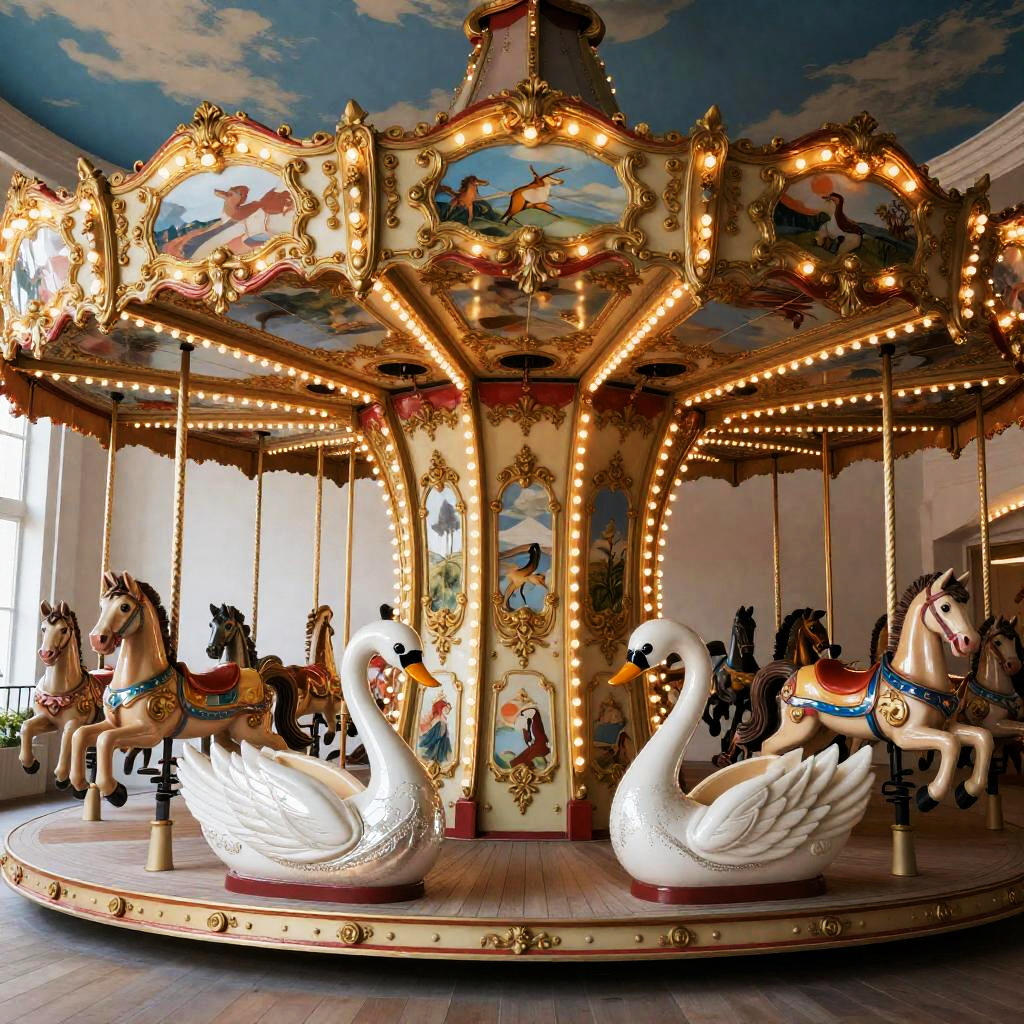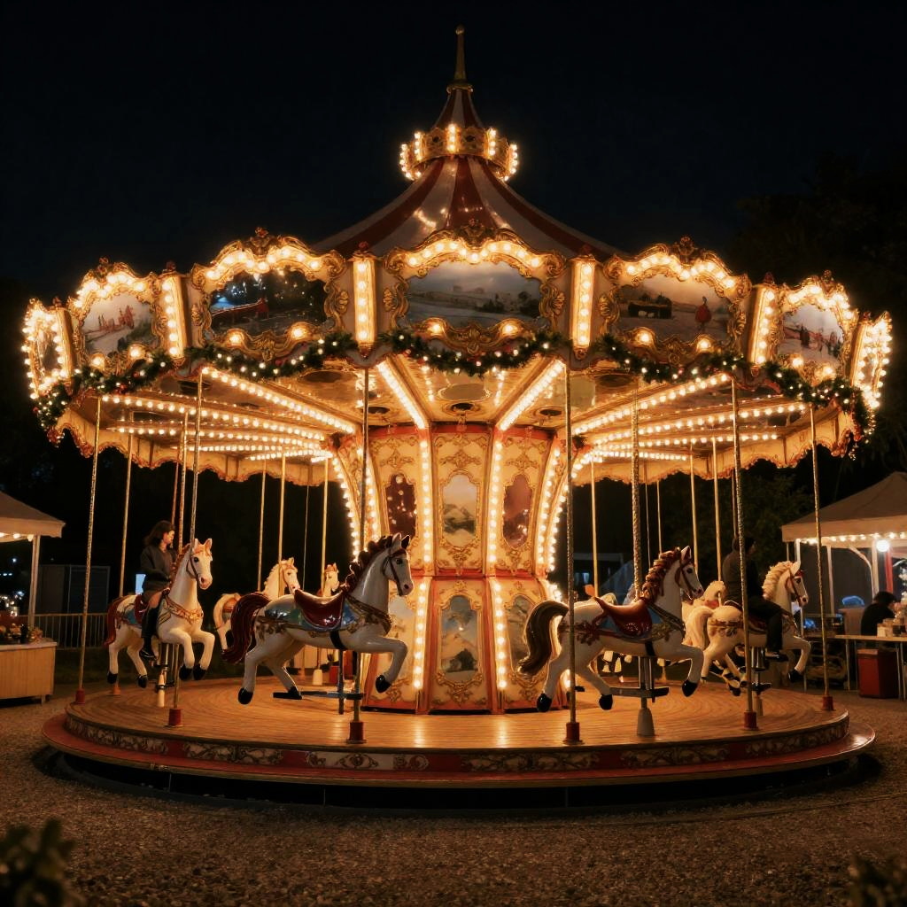 Vintage carousel at night. Round, illuminated carousel with red and white striped canopy, green garlands, and gold accents. Eight ornate, painted horses with riders, glowing lights, and festive decorations. Red velvet pillars surround the carousel. Gravel ground, dark night sky.