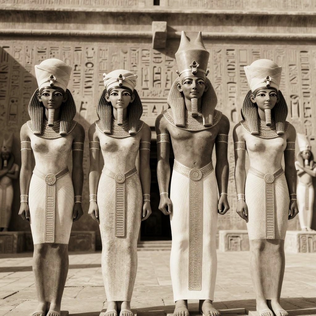 Sepia-toned photograph of four ancient Egyptian figures standing in front of a carved building. Three women in detailed, patterned dresses with head wraps, one man in a tall headdress and ornate robe. Man in center, women on left, right. All standing, facing forward. Carved building in background with intricate hieroglyphics and patterns. Man's expression is serious, women's expressions neutral. Two smaller figures partially visible in background.