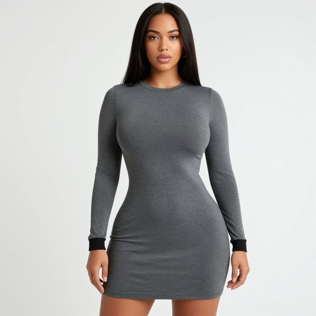 "Woman, casual, heathered grey bodycon dress, long sleeves, crew neck, mini-length, solid black cuffs, subtle silver ring on her finger. Sexy. Pretty face and beаutiful eyes. Big breasts."