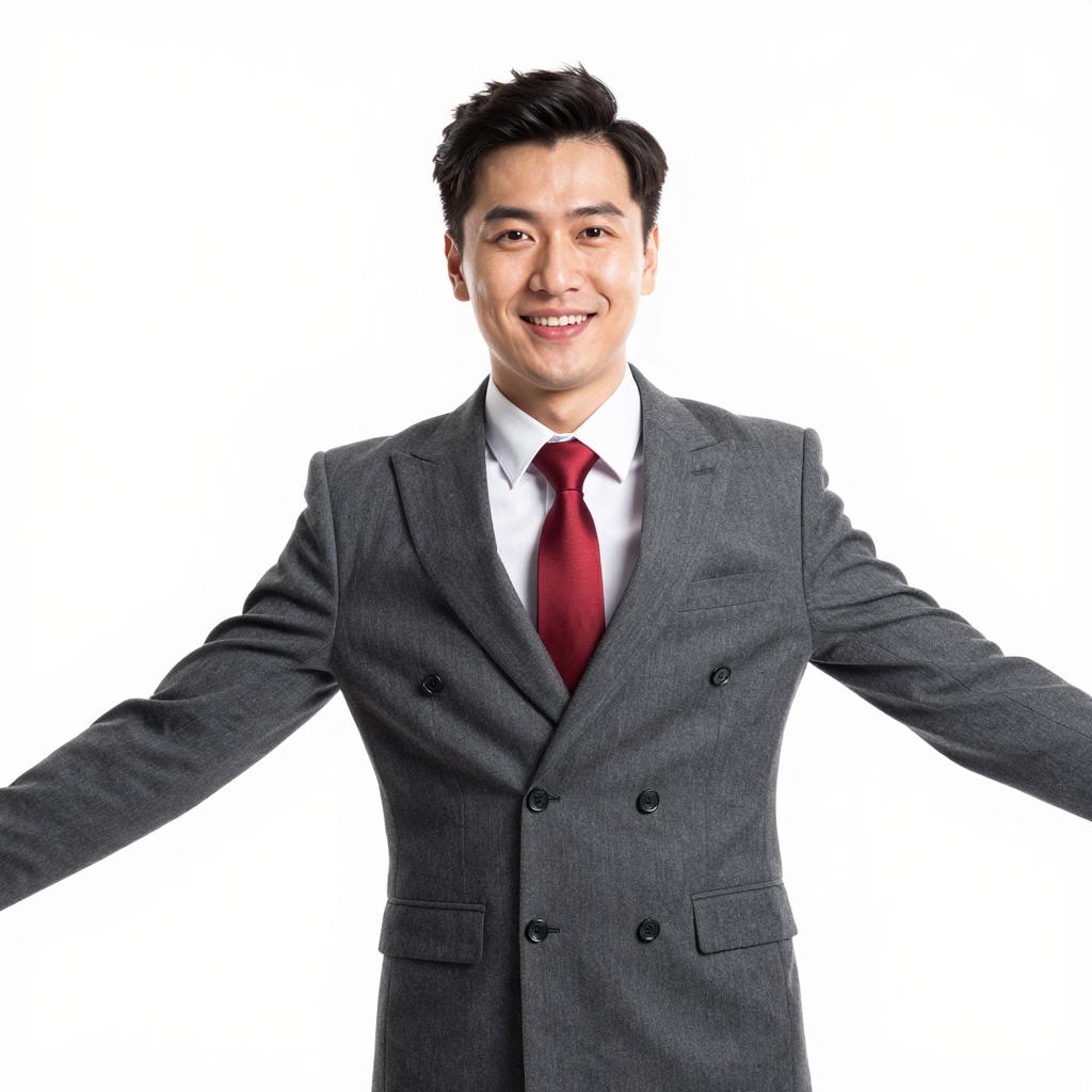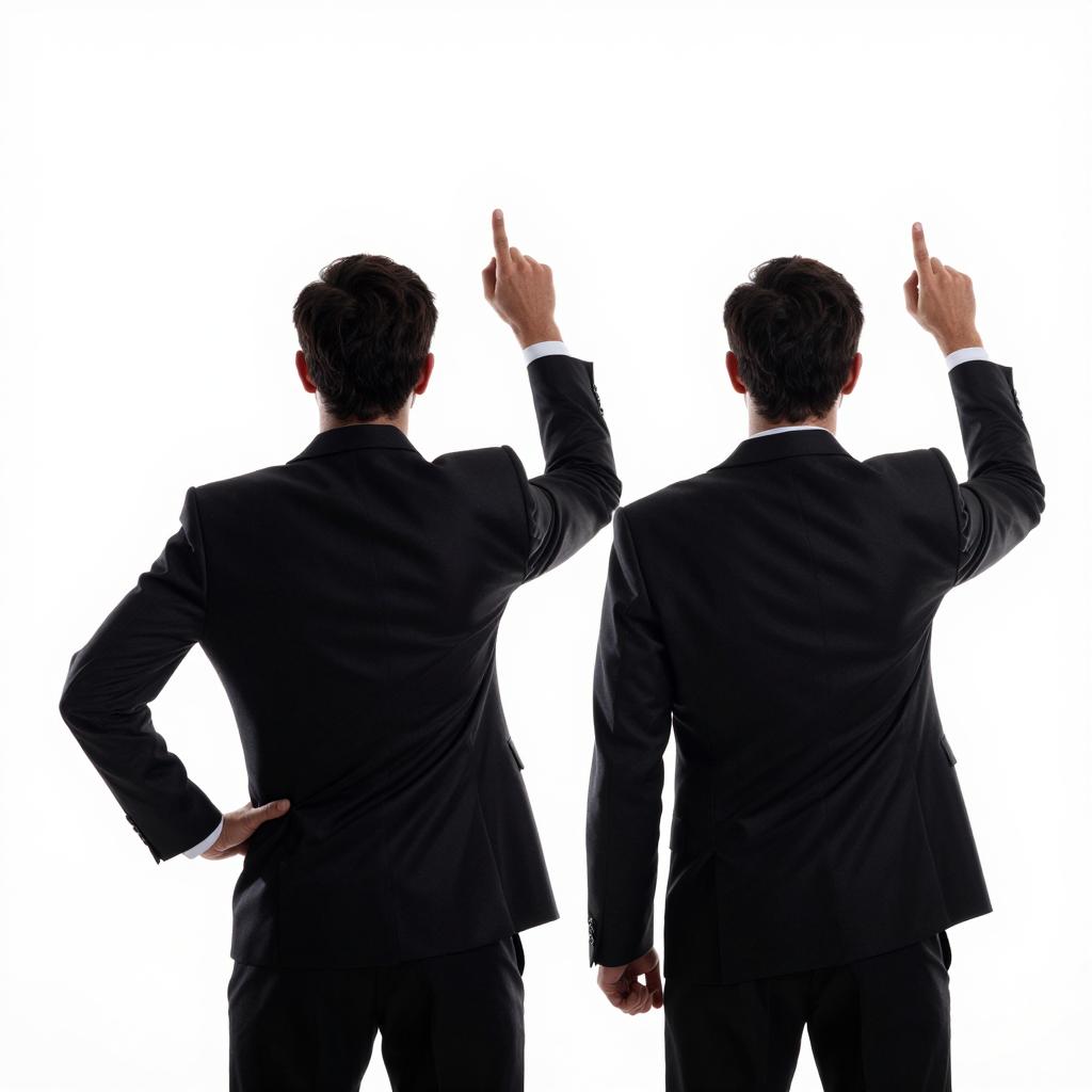 Photograph of two silhouetted men in suits, backlit against a white background. Both raise their right hands with index and middle fingers pointing up. Left man stands with hand on hip, right man stands with clenched fist. Both have dark hair.