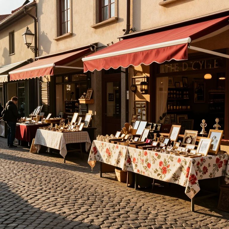 A cobblestone street lined with quaint shops under red awnings, bathed in golden-hour sunlight, evokes a vintage marketplace where tables draped in floral cloths display an array of trinkets and memories, trading not in currency but in fragments of nostalgia.