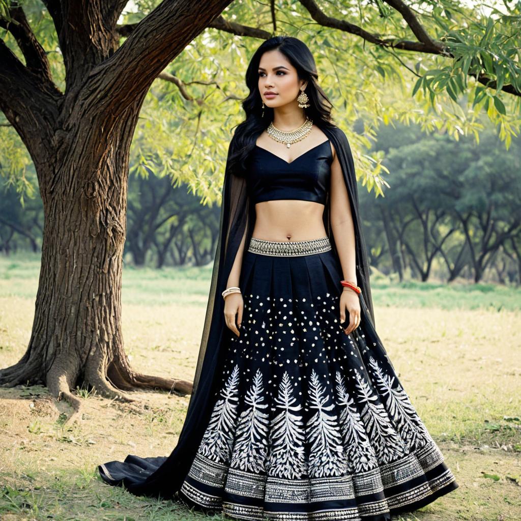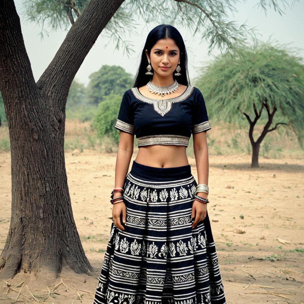 A young woman wearing a traditional Haryanvi folk dress, consisting of a black crop top and a long black skirt with white patterns, accessorized with traditional jewelry including a necklace, earrings, and multiple bracelets. She is standing outdoors near a tree, showcasing midriff and navel. The setting features dry land with scattered trees and shrubs in the background.