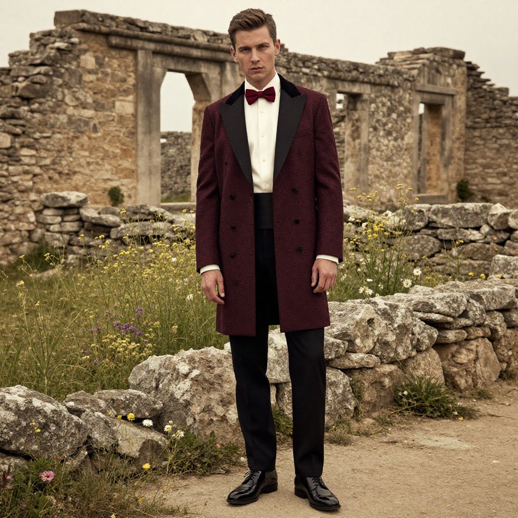 A man, burgundy frock coat, rich brocade fabric, contrasting black lapels, ivory dress shirt, deep red silk bow tie, tailored black trousers, glossy black derby shoes, ancient stone ruins, vibrant wildflowers, sepia effect, contemplative expression. Man has masculine face and piercing eyes