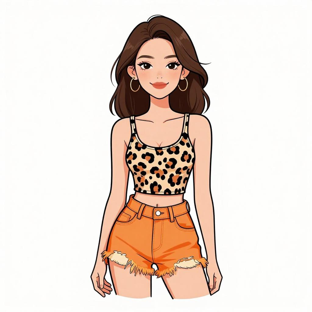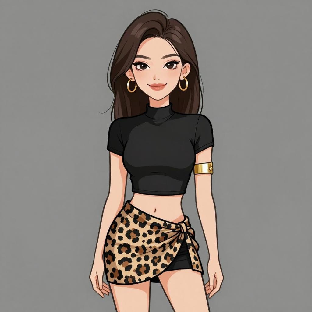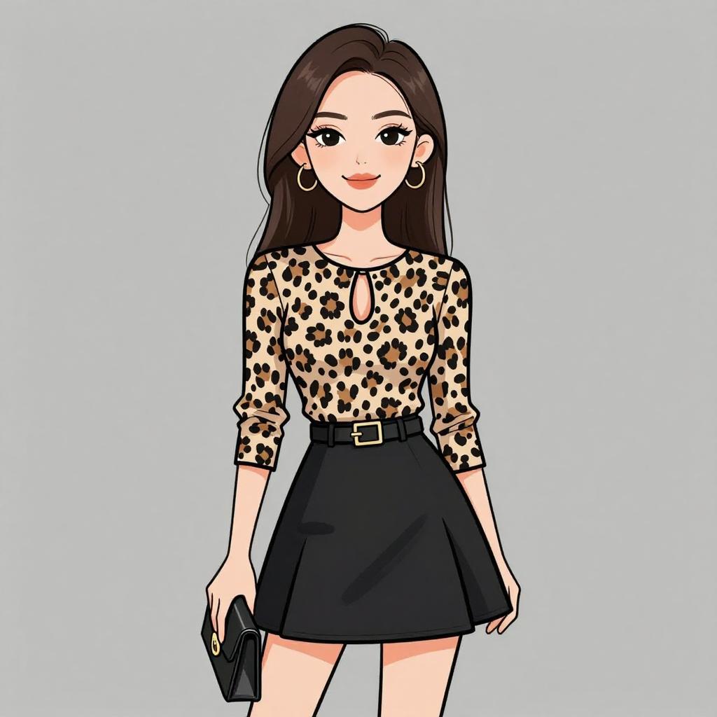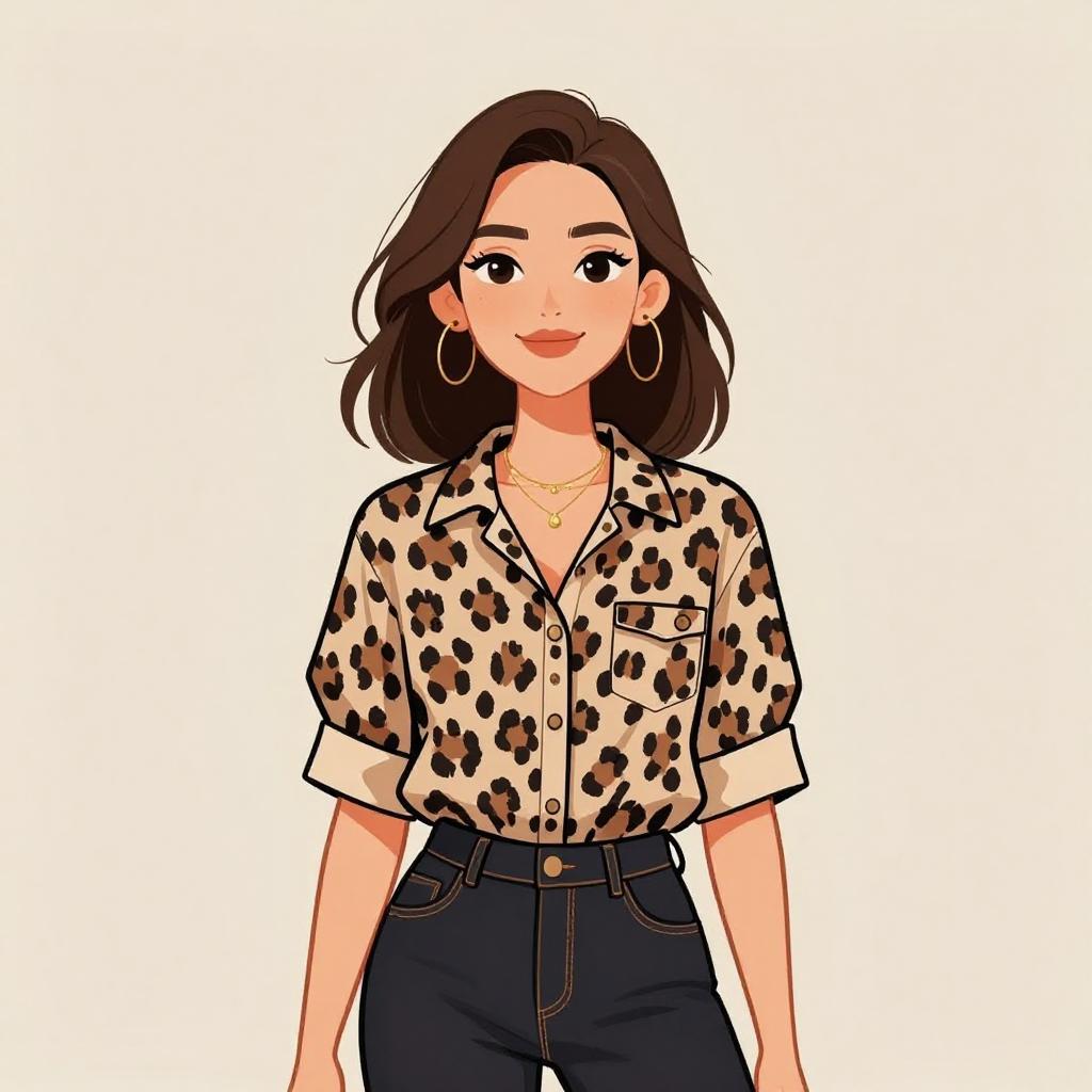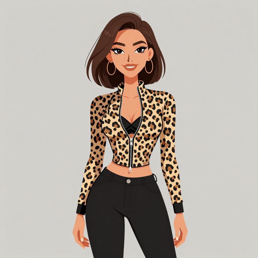 Woman with pretty face and pretty hair. smiling Woman, trendy fashion, leopard print jacket in warm tones, straight cut, lapel collar, long sleeves, black fitted pants, mid-rise waist, stretch fabric. --sref 1467