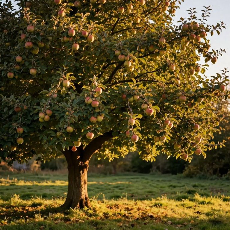 Photograph of a sunlit apple tree in a grassy orchard. The tree, with a sturdy brown trunk, is laden with ripe red and yellow apples, casting dappled shadows on the ground. Sunlight filters through the dense, green foliage, highlighting the apples and creating a warm, golden glow. The background features blurred, darker green trees and a patch of sunlight. The grass around the tree is slightly overgrown, adding a natural, rustic feel. The image captures the serene beauty of a late afternoon in an orchard.