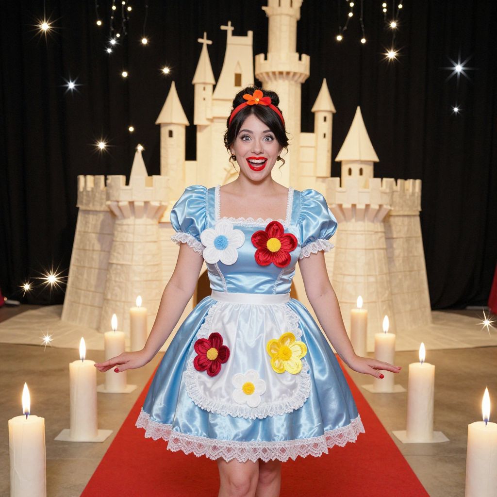 A fun, playful photo of a woman with bright red lips and a bright smile, wearing a cinderella maid costume with mismatched flowers on her dress, standing on a red carpet in front of a magical castle made of paper and candles, full of sparkles and fairy lights in the background.. The woman has big tits and cute face