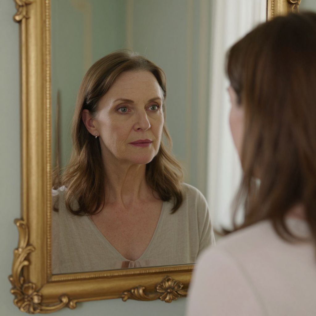 A digitally rendered portrait captures a woman gazing into a gold-framed mirror, her reflection revealing a slightly older version of herself adorned with subtle signs of wisdom, set against a serene, vintage-inspired aesthetic with soft, natural lighting.