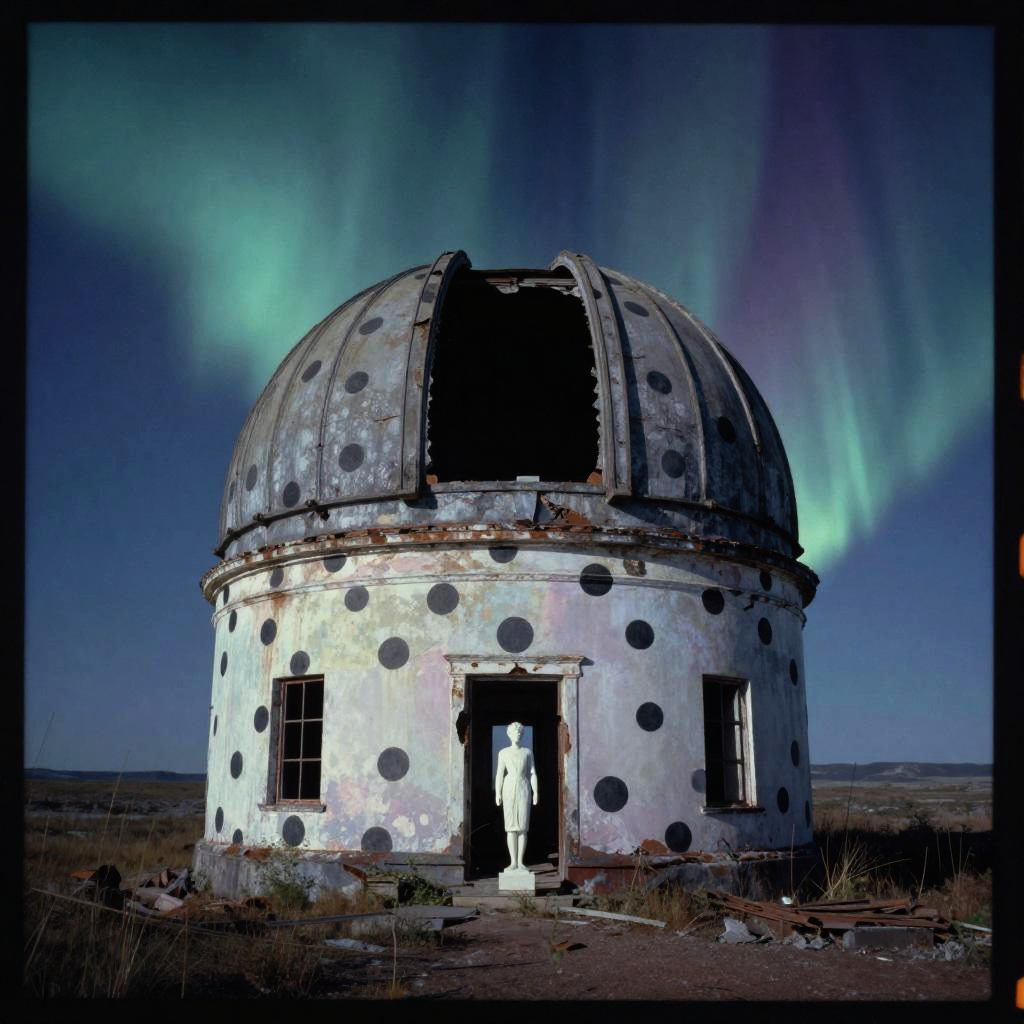 Abandoned observatory photonegative refractograph polkadot haute couture, haunting silhouette of the ancient ruins, aurora-lit night scene, pastel painting, sculpture