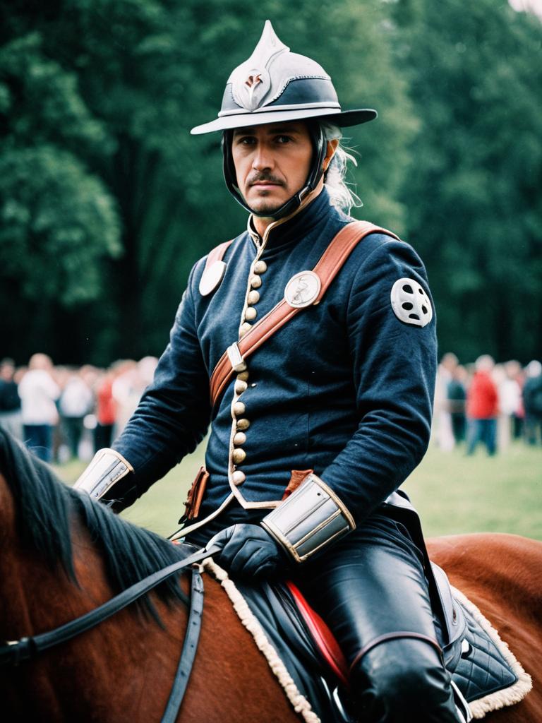 Man in Horse Rider costume, cosplay festival portrait, realistic textures