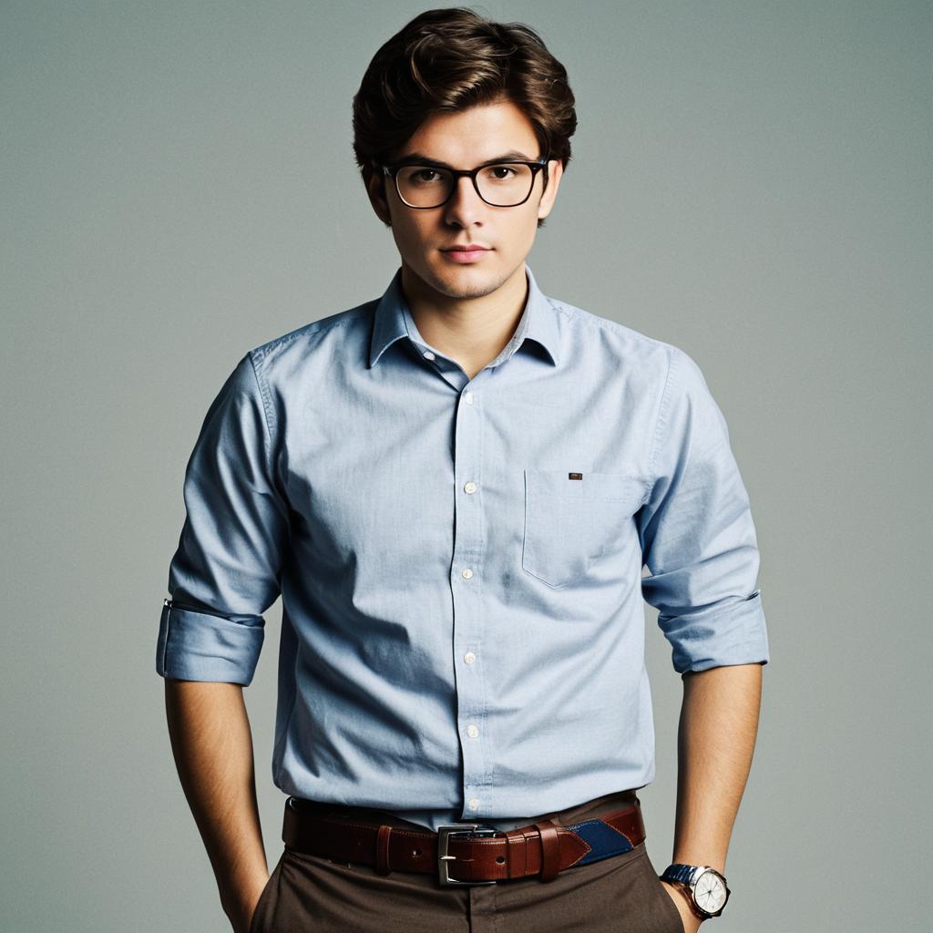 Portrait of a young Caucasian man with brown hair and brown eyes, wearing black-rimmed glasses, a light blue collared shirt with rolled-up sleeves, brown pants, a brown leather belt, and a wristwatch. The man has a serious expression and is looking directly at the camera against a plain gray background.