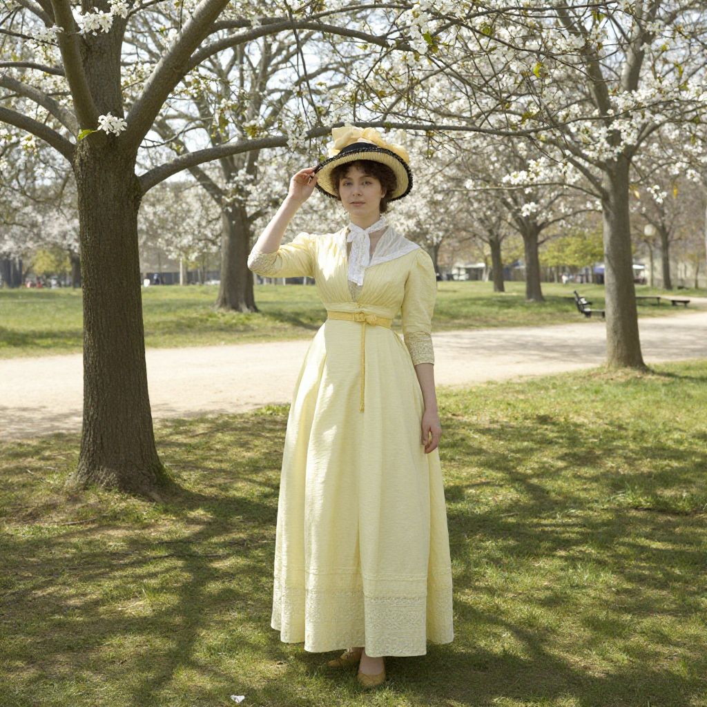 A photograph of a Caucasian woman standing in a sunlit park during spring. She wears a long, pale yellow, Victorian-style dress with lace sleeves and a white lace collar, and a wide-brimmed black hat with a white band. She has fair skin, dark brown hair, and is looking at the camera with a slight smile. The background features blooming cherry blossom trees with white flowers, and a grassy area with patches of sunlight and shadow. The park has a pathway and distant buildings visible through the trees. Her brown shoes are partially visible.