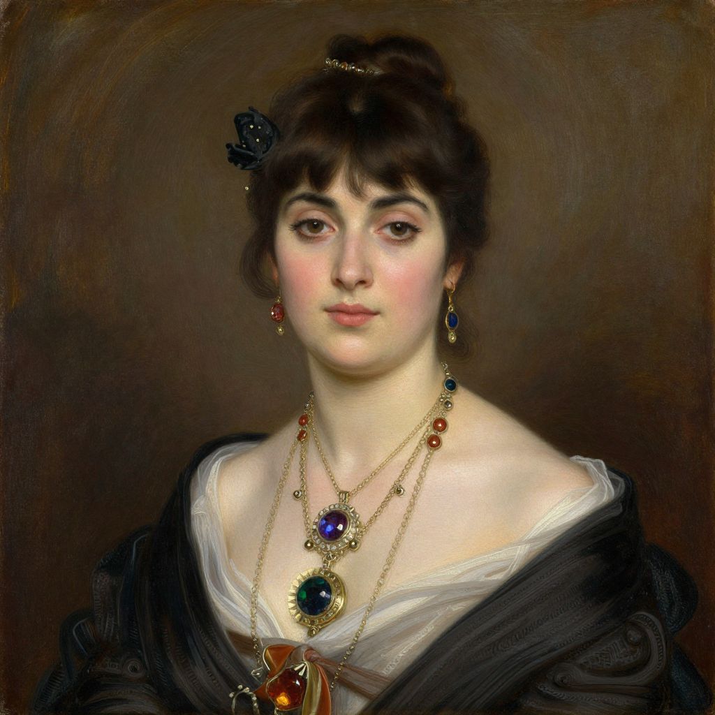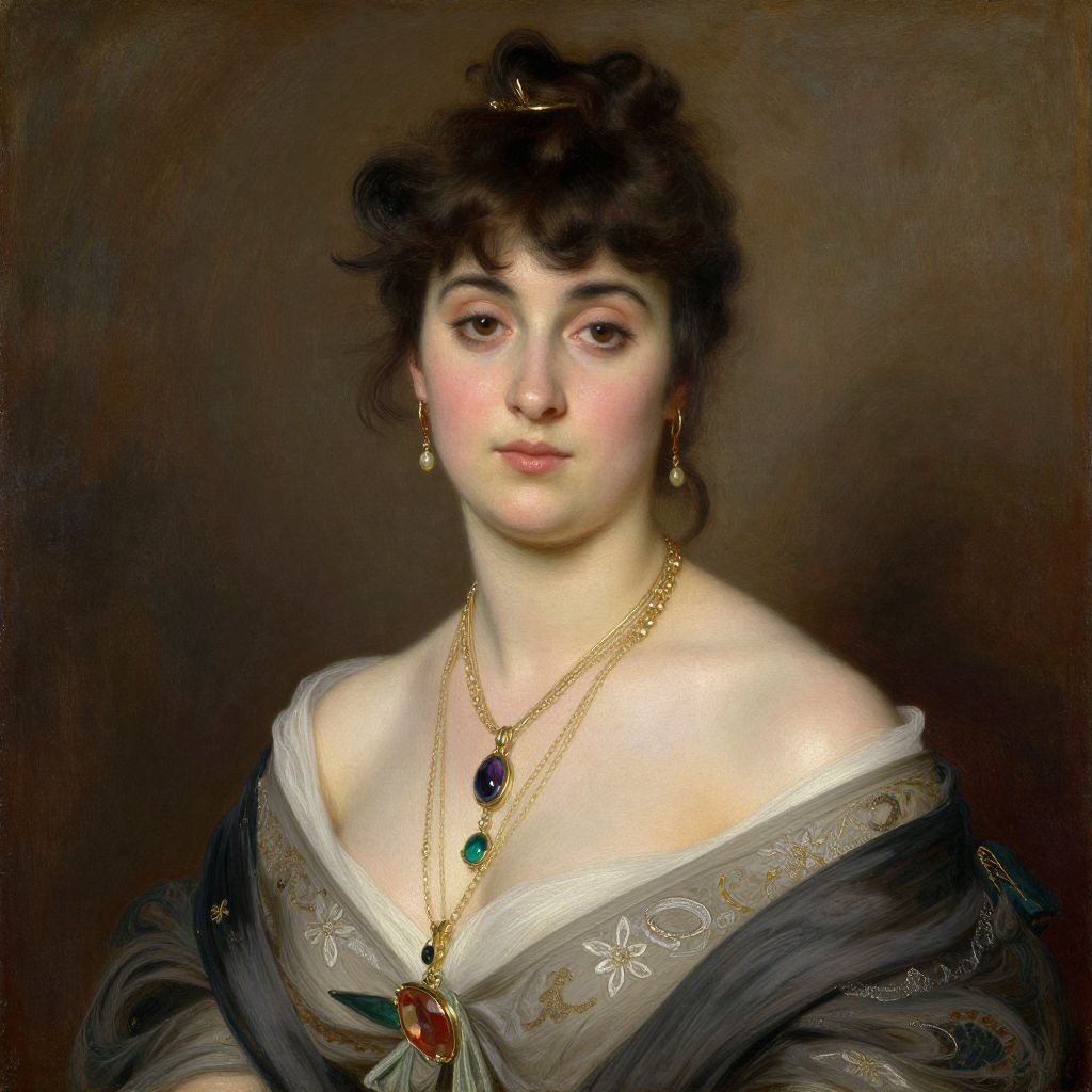 A finely detailed portrait rendered in a classical oil painting style, featuring a woman adorned in elegant attire and jewelry, evoking the refined aesthetic of Fernand Khnopff's work, with a focus on soft lighting and rich textures characteristic of Kunsthandel Studio 2000's artistic approach.