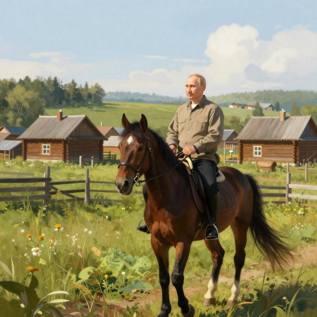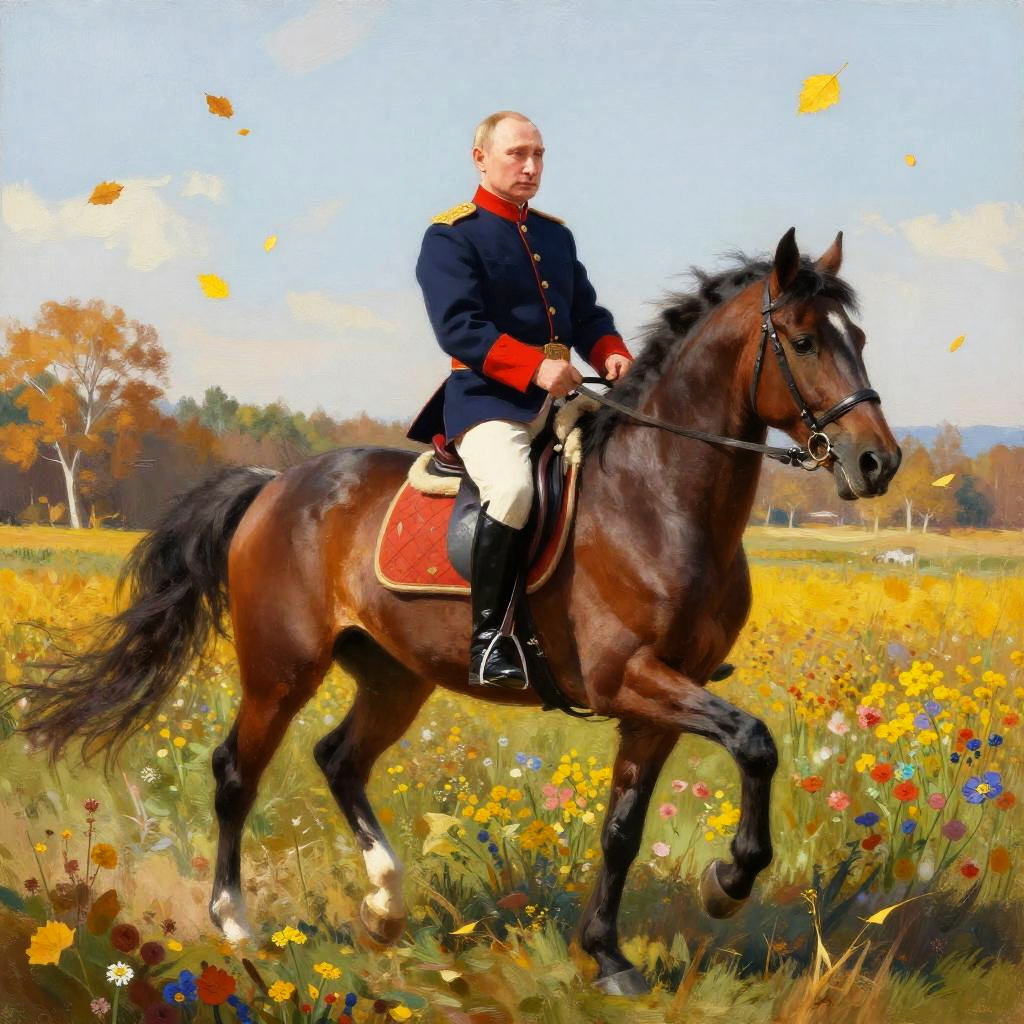 Putin riding horse across an open field of wildflowers, autumn season, golden leaves falling, confident and stoic, dressed in historical Cossack uniform, horse in mid-gallop, vibrant colors, painterly and detailed illustration.