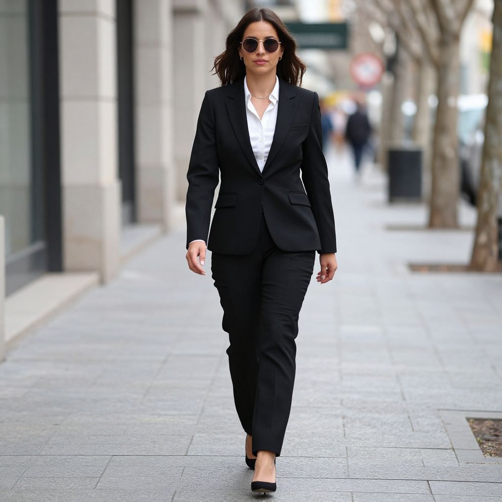 Smart Black Work Trousers Woman Costume, woman in a black suit and white shirt walking down a sidewalk