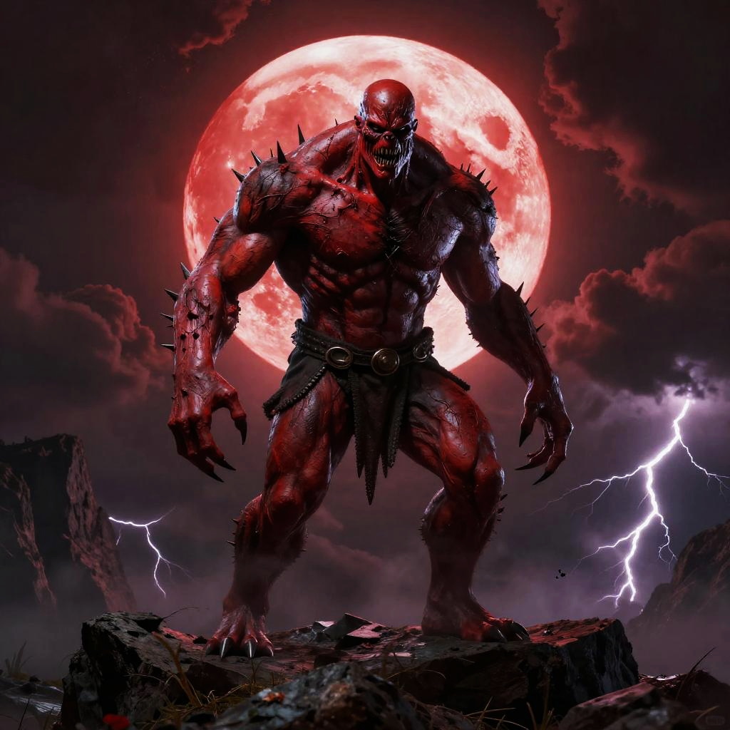 Red monster scary humanoid figure with muscular build, covered in scars and spikes, standing on a rocky cliff under a blood-red moon, ominous clouds and lightning in the background, dramatic and moody