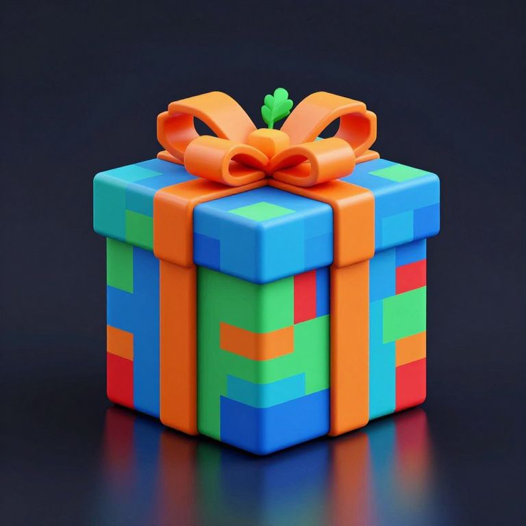 The image depicts a pixelated gift box, rendered in a high-resolution 8K format. The box is adorned with a vibrant, colorful pattern composed of various geometric shapes, including squares and rectangles in shades of blue, green, red, and orange. A prominent orange ribbon wraps around the box, tied in a neat bow at the top, which is further embellished with small green leaves. The box sits on a smooth, reflective surface, casting a soft shadow that accentuates its three-dimensional form. The overall composition is balanced, with the box centrally positioned and the colors vividly contrasting against the dark background, creating a visually striking and detailed scene.
