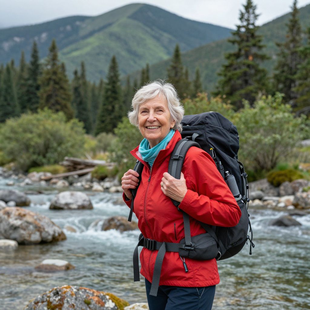 Senior woman hiking outdoors, wearing a vibrant red jacket, teal scarf, and carrying a large black backpack, smiles joyfully against a serene backdrop of lush green mountains, dense pine trees, and a tranquil river flowing through rocks.
