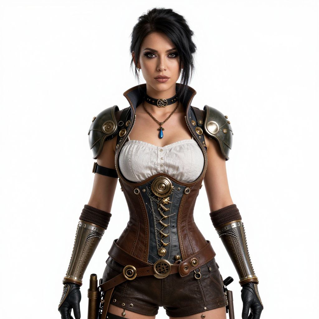 Photograph of a dark-haired woman with a pale complexion and intense gaze, standing against a white background. She wears a white, fitted, strapless top that accentuates her ample breasts, paired with a dark brown, leather corset adorned with metal buckles and intricate patterns. Her shoulders are protected by black, metallic shoulder guards. She also wears black arm bracers, brown shorts, and black gloves. A black choker with a blue gemstone necklace rests around her neck. Her short black hair is styled to one side, adding to her tough, adventurous look. The image has a high-contrast, digitally-enhanced style.