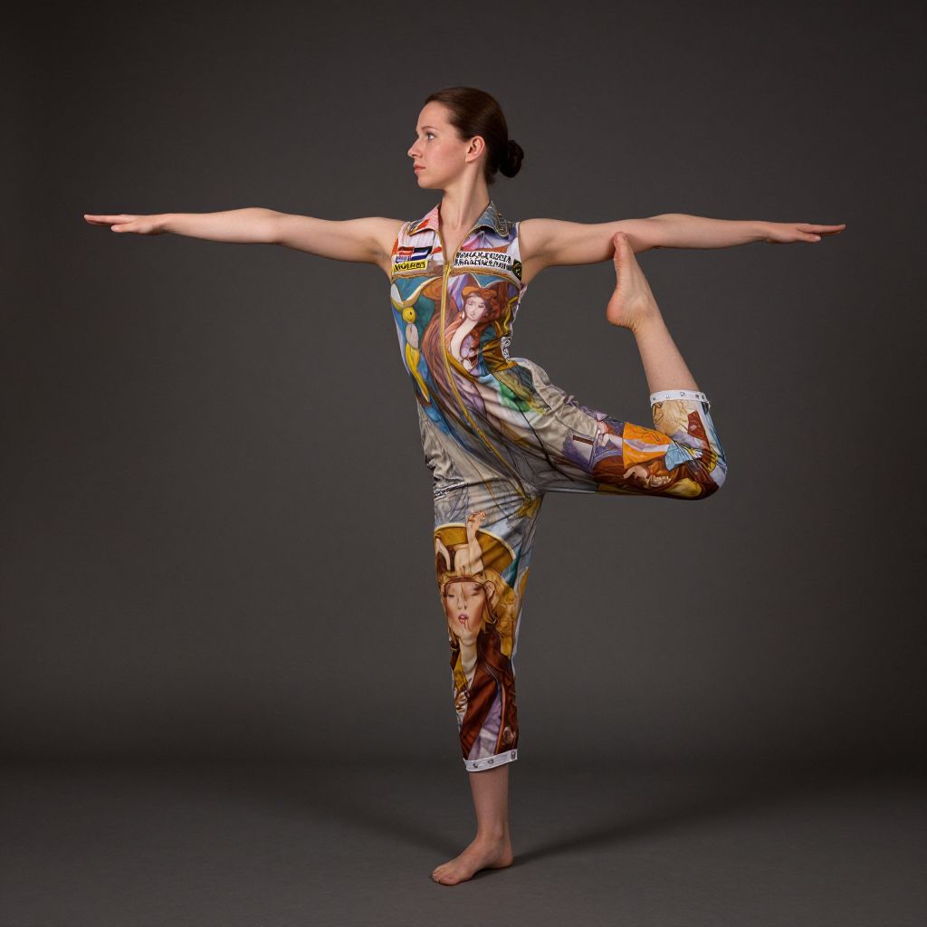 An octane render. hyper detailed full body portrait of a russian girl doing yoga wearing a pilot jumpsuit dress designed by balenciaga by alphonse mucha, norman rockwell and john berkey