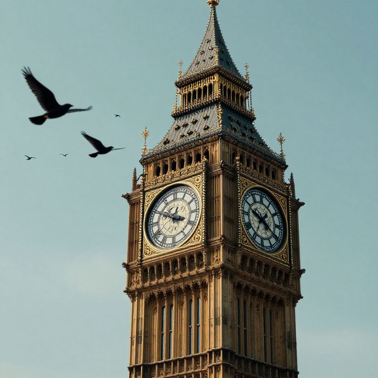 Photograph of the Elizabeth Tower (Big Ben) in London, showcasing its ornate, Gothic-style clock tower against a clear blue sky. The tower's detailed, golden-brown stone facade features large black clock faces with white Roman numerals and black hands. Three black birds are flying in the upper left corner, adding a sense of motion to the static structure. The clock's intricate stonework and pointed spire are prominently displayed. The sunlight highlights the textures and patterns of the tower, enhancing its historic and majestic appearance.