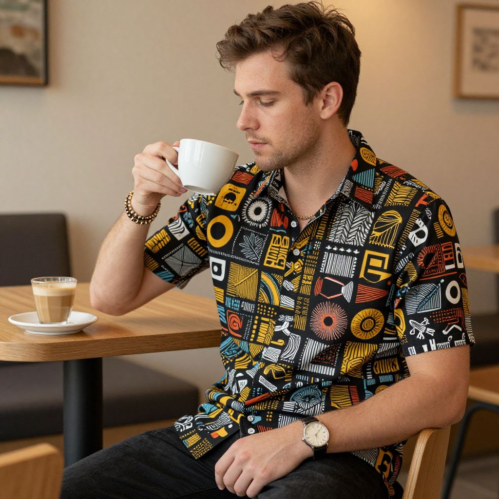 Bold print shirts on a European man in a casual setting, holding a coffee cup in a cozy indoor café, warm lighting, stylish accessories, high-quality realistic image, natural expressions.