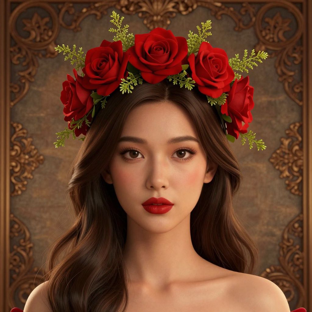 A digitally rendered portrait captures a woman adorned with a vibrant rose crown, featuring red roses and delicate greenery, set against a richly detailed, vintage-style backdrop with ornate patterns and warm, golden-hour lighting.