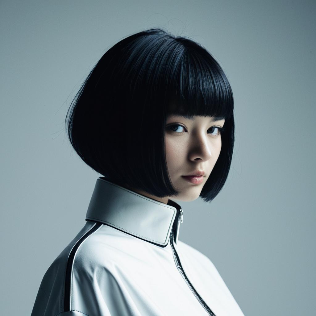 Asymmetrical Bob hairstyle on woman, wearing avant-garde metallic dress, in rooftop terrace at sunset, captured in fashion editorial style with golden hour lighting.