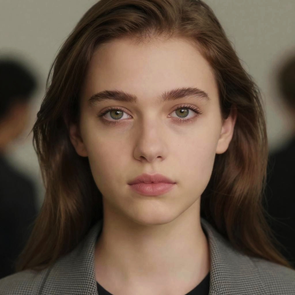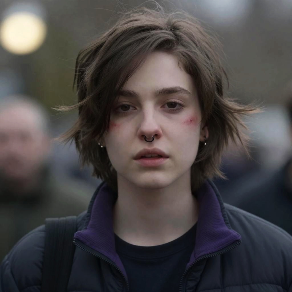 Photograph of a young person with short, wind-swept brown hair, pale skin, and a slightly open mouth. They have a small black nose ring and a visible red bruise on their right cheek. Wearing a dark, puffy jacket with a purple collar. Blurred background with bokeh lights. Facing forward, slightly to the left.
