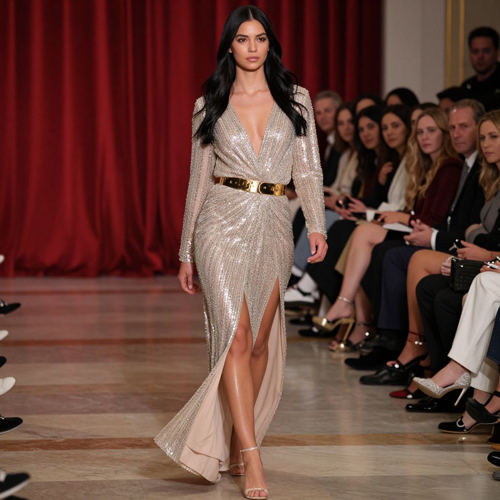 Photograph of a runway show featuring a confident woman with long black hair, wearing a shimmering, silver-sequined dress with a deep V-neck and a gold belt. The dress has a high slit, revealing her toned legs. She's walking on a polished marble floor, with an audience seated on both sides in formal attire, and luxurious red curtains in the background.