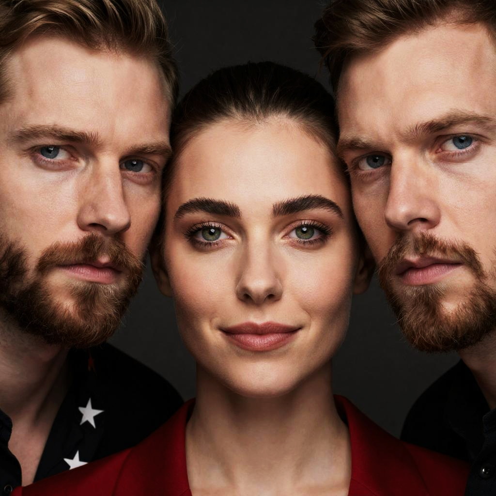 Photograph of three close-up faces, central woman with green eyes, flanked by two men with blue eyes and beards. Men wear star-patterned clothing, woman in red. Intense expressions, slight smile on woman's face, serious looks on men's faces.