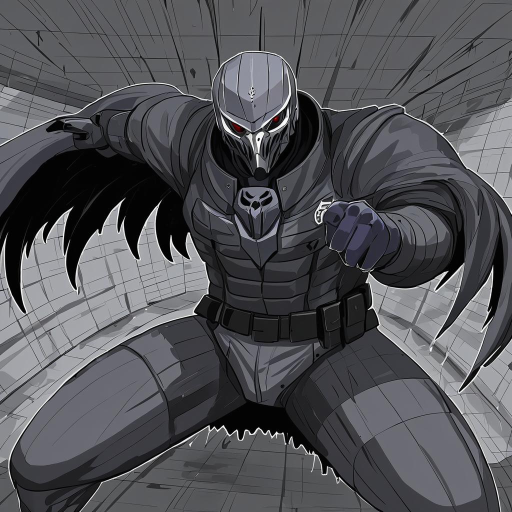 Digital anime-style illustration of Alpha, a character from the game Punishing: Gray Raven. Alpha is depicted wearing a sleek, dark tactical outfit with wing-like extensions and a mask featuring red glowing eyes, set against a tiled background in a dynamic, aggressive pose.