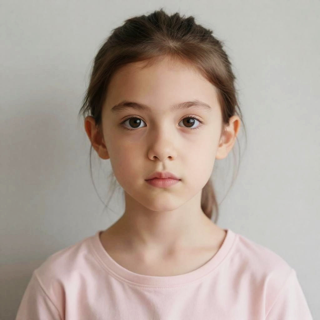 Realistic photo.Portrait of a young girl styled with Modigliani's distinct elongated features. Incorporates a soothing pastel pinks and soft greys and a textured background. The composition focuses on a close-up of the girl’s face, emphasizing large round eyes and simplified forms. realistic photo