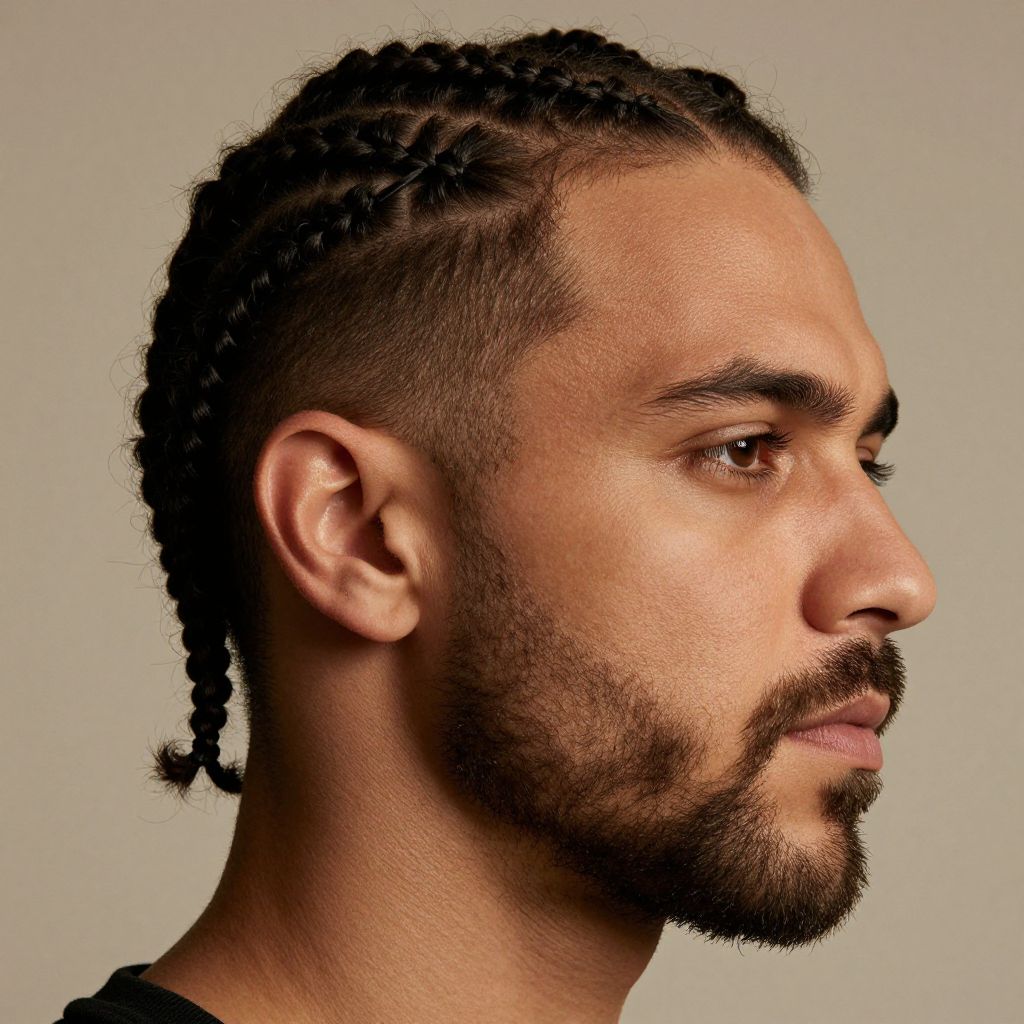 Short braided beard, close-up portrait of a man with a neatly styled short braided beard, intricate details in the braids, warm lighting, rugged yet modern look, textured skin, high resolution, studio background, fashion editorial style.