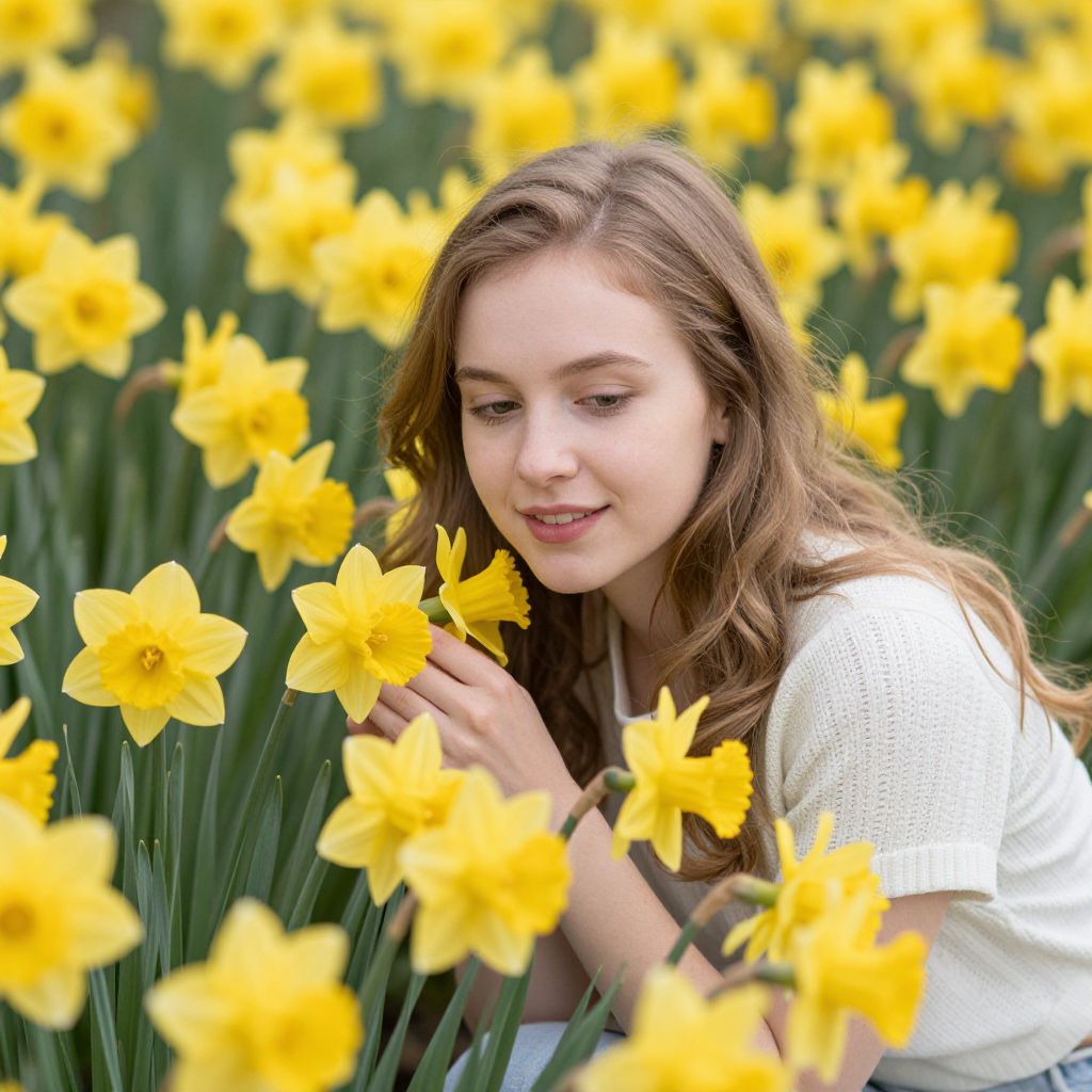 Embracing the ephemeral beauty of spring, a radiant young woman finds solace and joy amidst a sea of golden daffodils, their sweet fragrance intertwining with the gentle hum of life and the promise of renewal.
