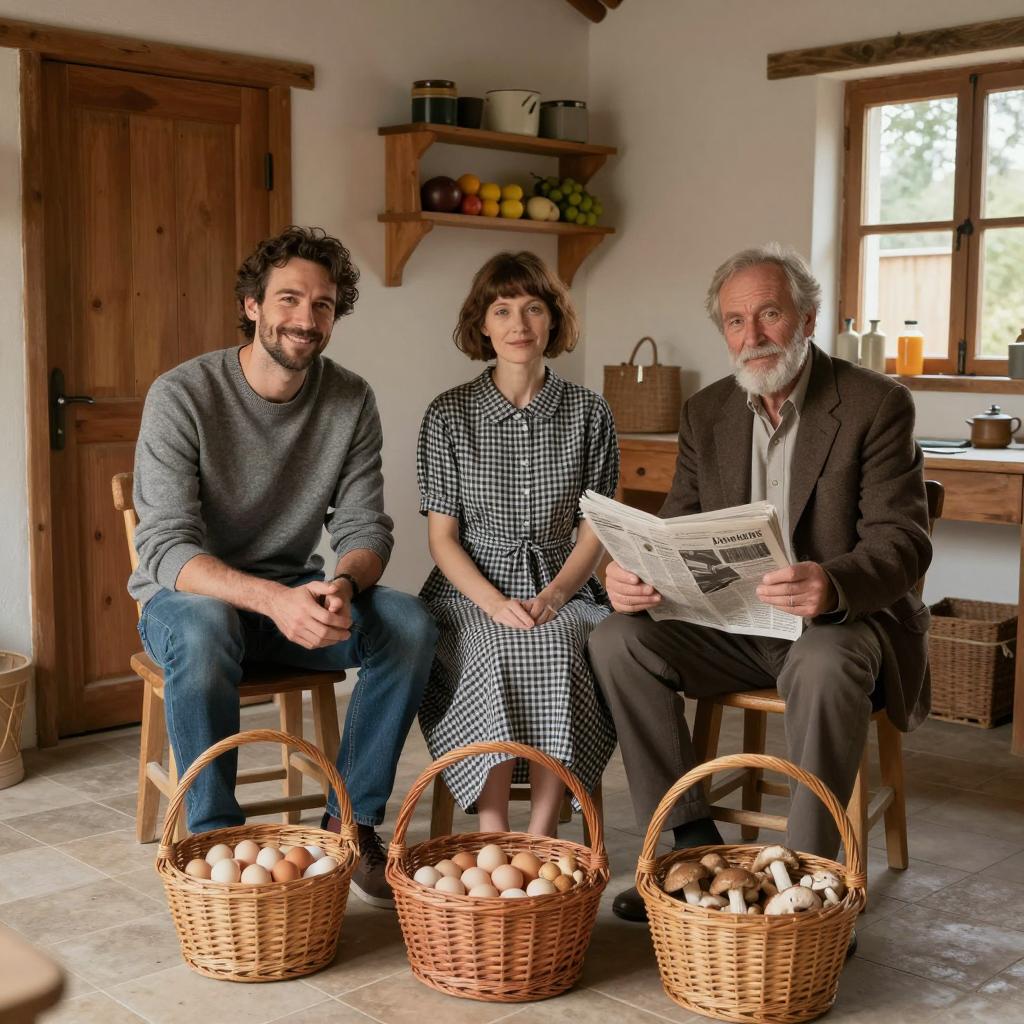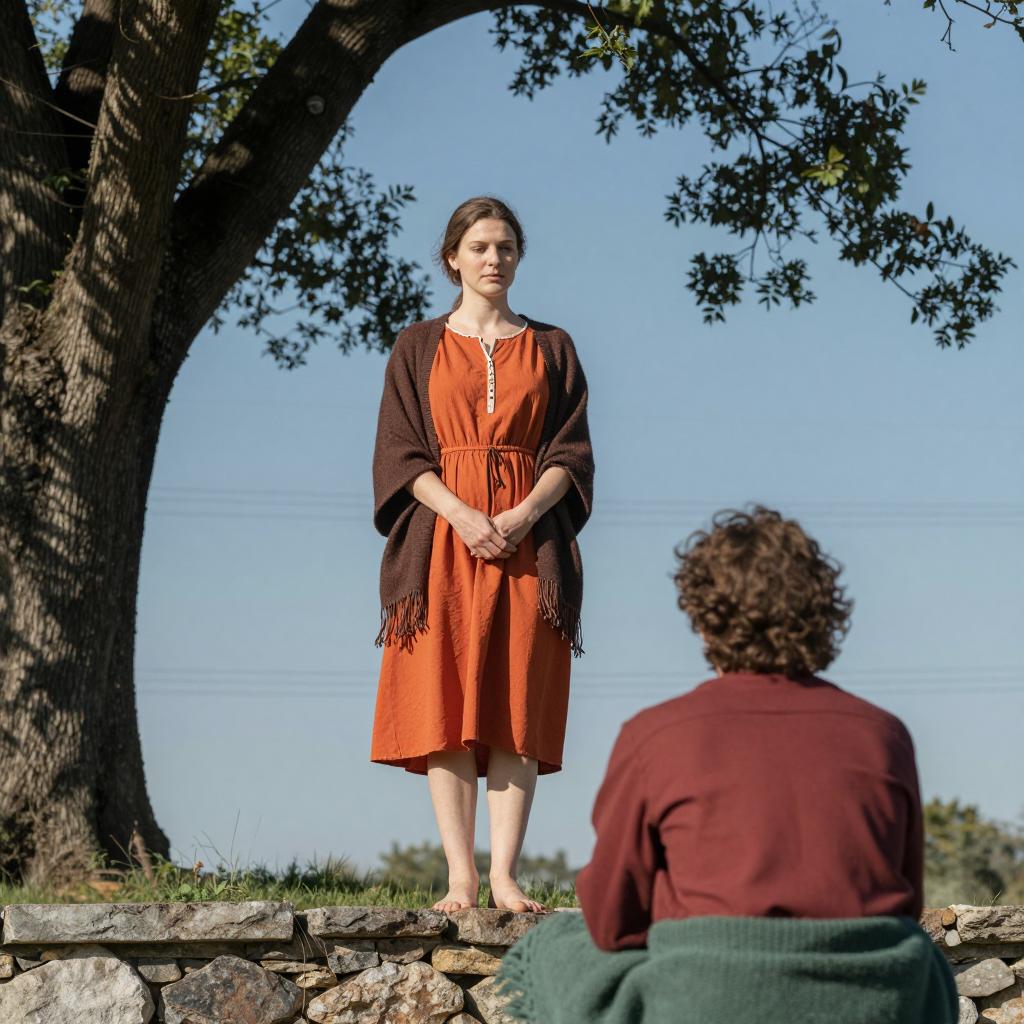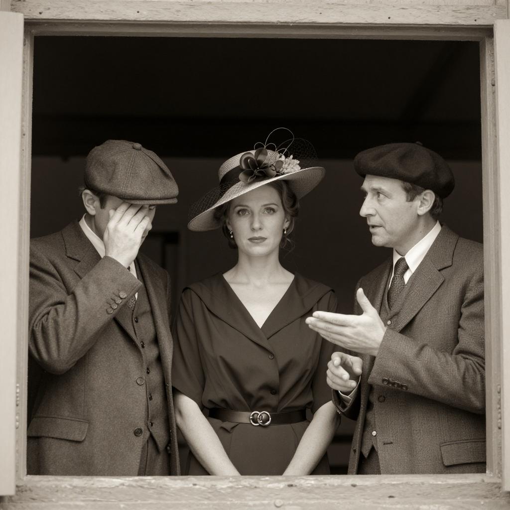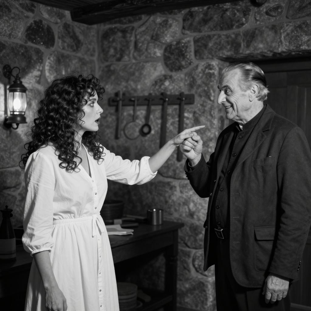 Mid-20th century photograph of a dimly lit room. Central woman with curly brown hair, blue dress, white sleeves, arms raised, bound to wooden beams. Four men, one in red cap, one in brown shirt, one elderly in fur coat, one partially obscured. Red meat on table in foreground. Stone walls, wooden beams. Intense expressions on central woman and elderly man.