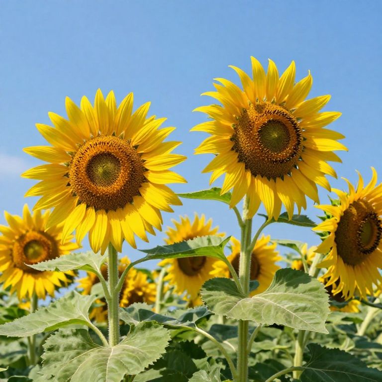 Vibrant sunflowers stand tall against a clear blue sky, their golden petals radiating warmth as they sway gently in the breeze, surrounded by lush green foliage in a serene outdoor setting.