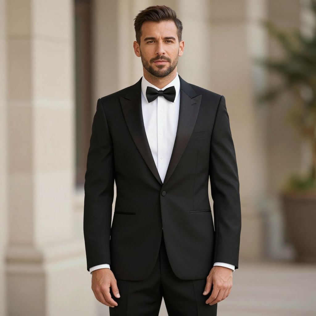 Photograph of a handsome Caucasian man with a well-groomed beard and short dark brown hair, wearing a classic black tuxedo with a white dress shirt and black bow tie. He has a strong, confident stance and a slight smile. The background is blurred, showing beige stone columns and a potted plant, suggesting an elegant, indoor setting. The man's skin tone is light, and his physique is lean and fit. The overall image has a sharp focus on the man, with a shallow depth of field, adding a professional and sophisticated feel.